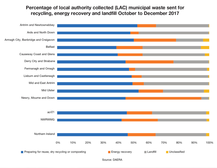 The latest local authority collected (LAC) municipal waste management statistics (October to December 2017) published by the Department of Agriculture, Environment and Rural Affairs (DAERA) indicate that household waste accounts for 89.3 per cent of total LAC municipal waste.