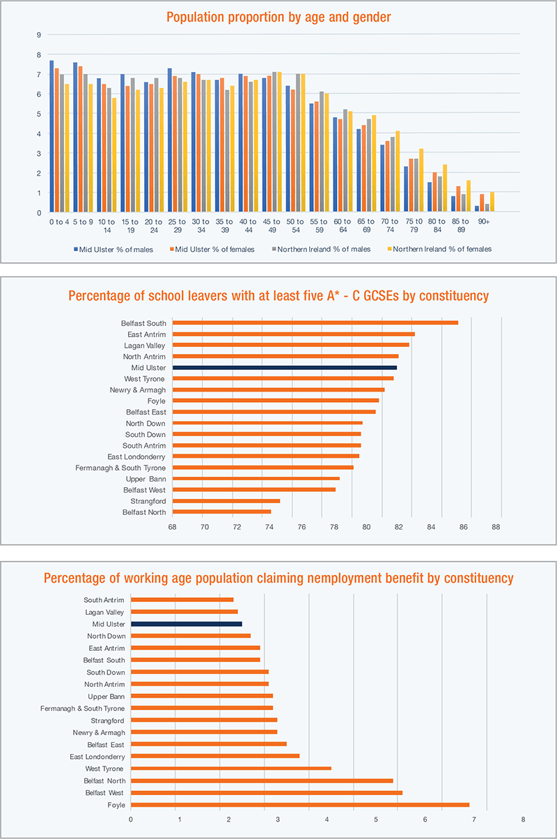 The constituency has a higher proportion of children and young people and lower proportion of older people when compared to the Northern Ireland average. 23 per cent of Mid Ulster residents are below the age of 15, higher than the Northern Ireland average of 20.8 per cent; older people make up 13.7 per cent of Mid Ulster’s population, 15.8 per cent of Northern Ireland’s population are classified as older people.