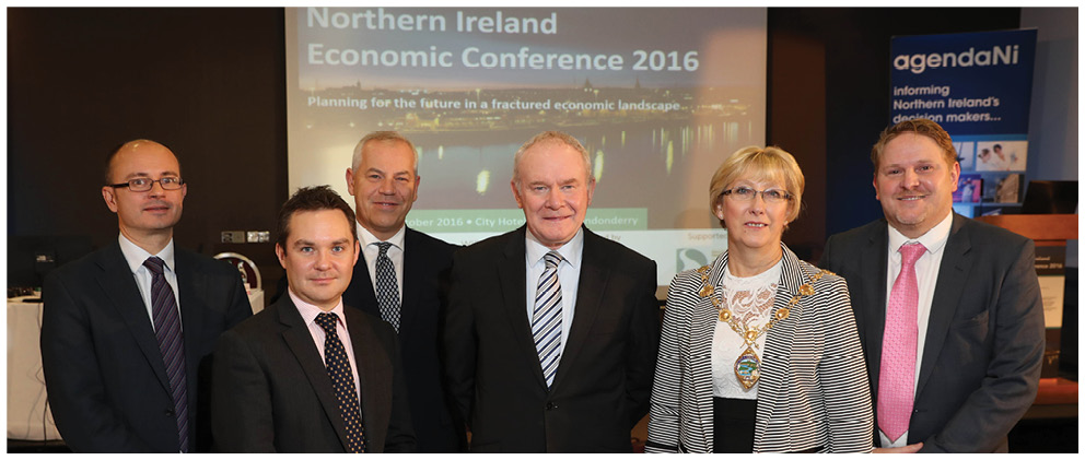 Chris Giles, Financial Times; John Campbell, BBC Northern Ireland, John Kelpie, Derry City & Strabane District Council; deputy First Minister, Martin McGuinness, MLA; Hilary McClintock, Mayor of Derry City & Strabane District Council and Neil Gibson, Ulster University.