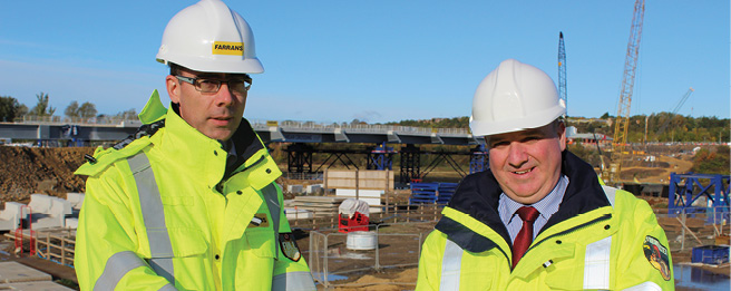 Farrans’ Stephen McCaffrey (left) on site in Sunderland with Moore Concrete’s Richard Whiteside as the new bridge over the River Wear continues to take shape behind them.