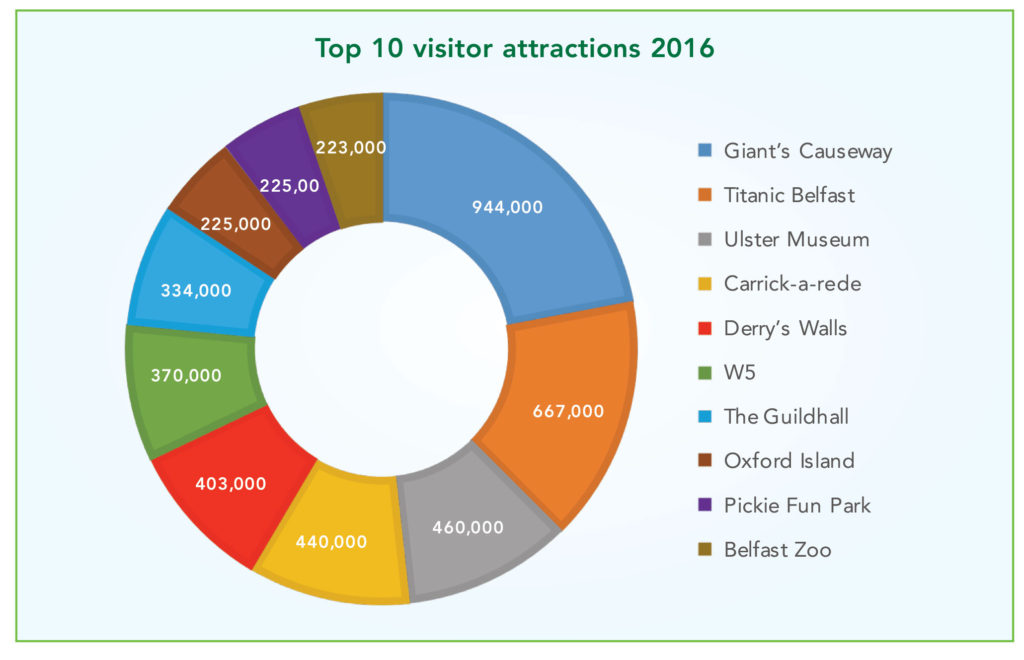 Out of the 400 visitor attractions surveyed at the end of December 2016, it is estimated that there were a total of 15 million visits made in 2016. Excluding country parks, the Giants Causeway World Heritage Site was the biggest draw, improving by 11 per cent on the previous year and coming close to the 1 million visitor mark (944,000). Titanic Belfast, Northern Ireland’s second most popular attraction in 2016, attracted 667,000 visitors, up 7 per cent from 2015.