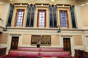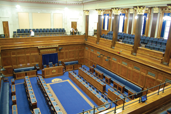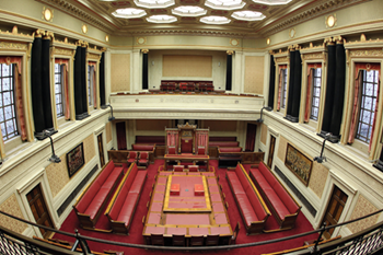 The Senate Chamber is the best preserved remnant of the old Northern Ireland Parliament, largely unchanged since 1932. Senators rubbed the Irish linen damask wall panelling for luck, hence the wear and tear near the doors. It now provides a grand setting for committees and occasional services of worship (e.g. on Armistice Day).