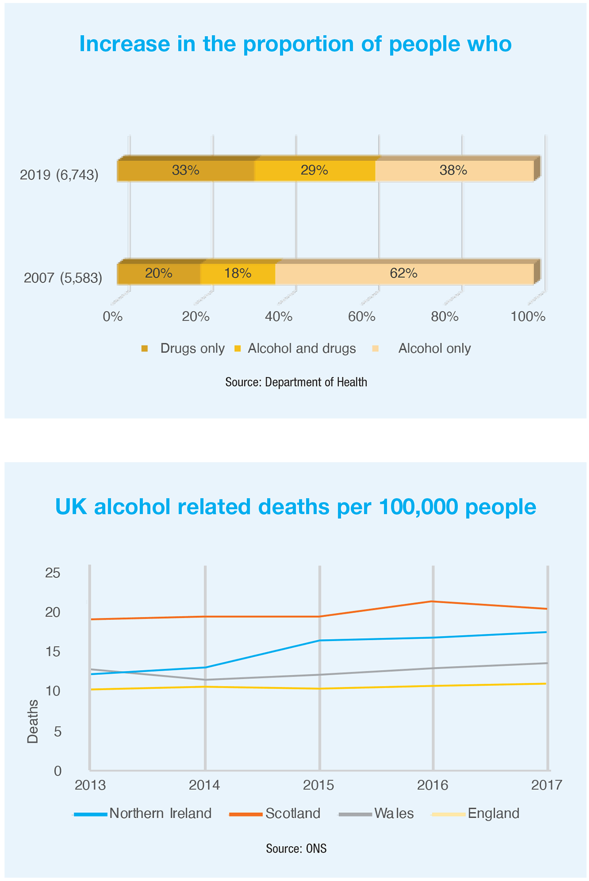 Alcohol misuse deaths in Northern Ireland have risen higher than anywhere else in the UK, up 40 per cent since 2013. At the same time, the numbers seeking treatment for drug misuse have almost doubled from 2,107 in 2007 to 4,100 in 2019. While alcohol remains Northern Ireland’s deadliest substance in terms of misuse, strikingly, the NIAO estimates that drug misuse deaths have increased by more than 200 per cent over this period.