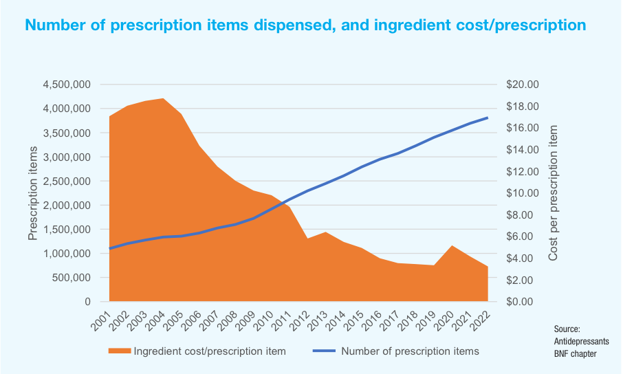 Despite an increase in the number of prescription items dispensed, the cost of prescribing antidepressants has reduced significantly, almost halving in the past 20 years.