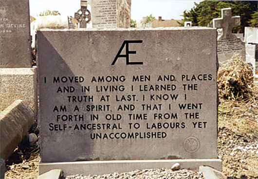 As a writer Russell adopted different pen-names. Once, opening a book at a random page the word ‘Aeon’ seemed to jump out at him and he was charmed that ‘Aeon’ was a term meaning the earliest living creatures. He immediately used it as a pen-name for a philosophical article. However the printer could only make out the first two letters of his writing and thus ‘AE’ appeared below the article. AE stayed with him thereafter.