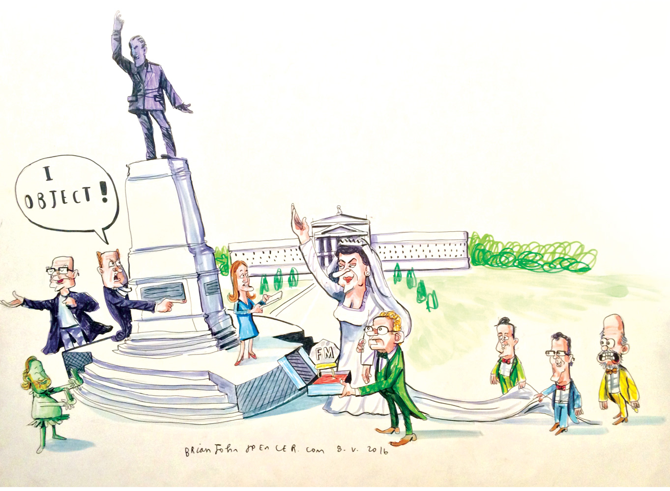 Following the cartoon, Spencer appeared on local radio and was accused by some of being unionist-leaning. He admits to being unprepared for the question but answers in hindsight: “What I should have said was I have no political master. I was born into a Presbyterian/Protestant/unionist background but I am an independent thinker who, as an artist, aims to be counter-mainstream. I’m extremely Irish but proudly British as well.”