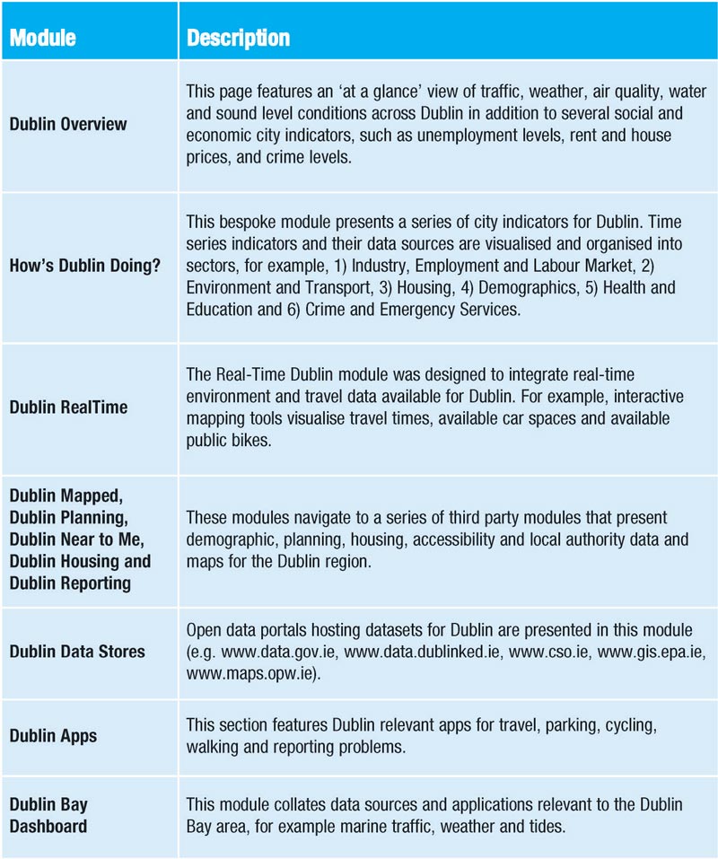 The smart city and open data initiatives have served to promote the release of these data, traditionally managed by city departments and agencies, into the public domain via government and local authority data portals (e.g. www.data.gov.ie, www.dublinked.ie). The availability of administrative and real-time data has stimulated the emergence of city dashboards internationally. Simply put these city dashboards are a way of communicating how the city is operating using a range of static and real-time interactive data visualisations (e.g. gauges, maps, graphs, video/photos and 3D models) via the internet. Dashboards can be seen as a user-friendly, intuitive means for organising and visualising complex city datasets; administrative data sets can be used to monitor and evaluate a variety of city indicators, such as unemployment, public transport journeys and house prices, allowing for intra/inter-city comparisons to be made; and citizens can quickly access real-time information on the current air quality, weather and traffic and travel conditions.