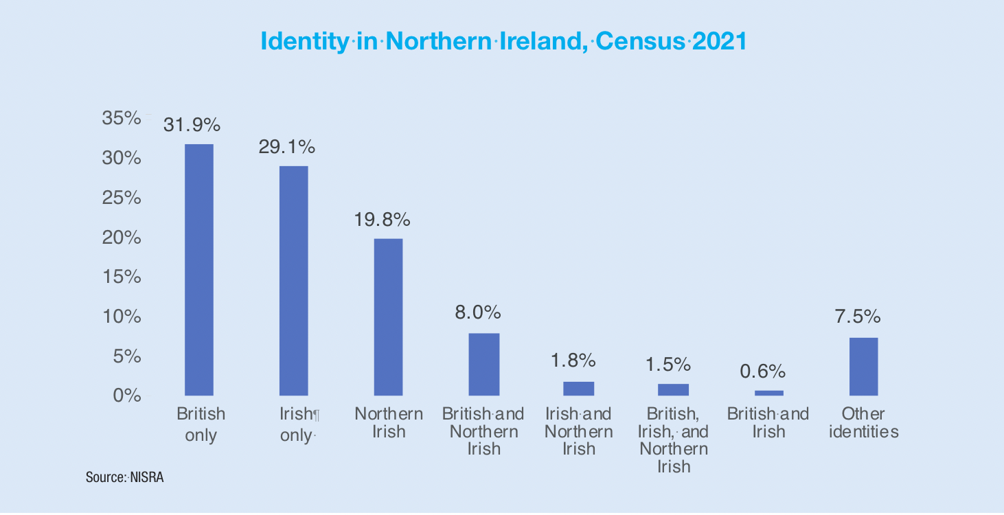 Within the 42.8 per cent of the population who identified as feeling some form of Britishness, 8 per cent of the population identified as both British and Northern Irish. The figure of 42.8 per cent is down from 48.4 per cent who identified as such in the 2011 Census.