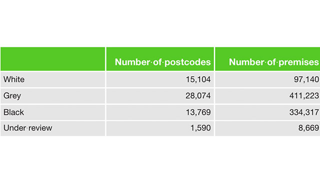 White= No qualifying broadband infrastructure and none is likely to be developed within three years.