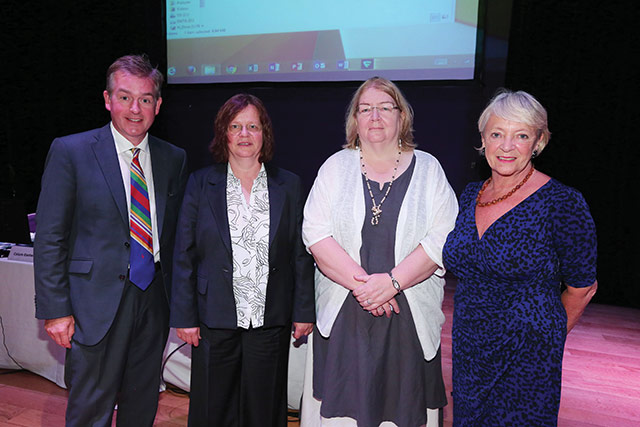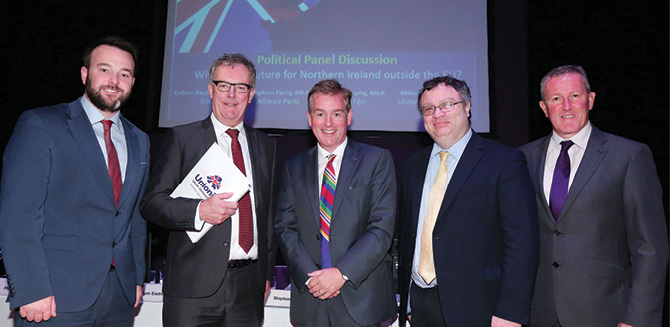 Colum Eastwood, MLA, SDLP; Mike Nesbitt, MLA, Ulster Unionist Party; Conference chair Mark Carruthers; Stephen Farry, MLA, Alliance Party and Conor Murphy, MLA, Sinn Féin.