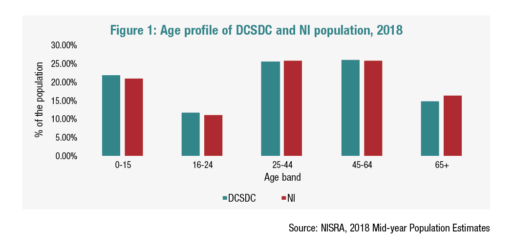 In 2018, Derry and Strabane District Council’s (DSDC) population was estimated at over 150,500 with an average age of just under the Northern Ireland average. The largest gaps were in the youngest and oldest age groups. 21.8 per cent of the Council’s population were under the age of 16 compared to the 20.9 per cent Northern Ireland average and 14.9 per cent were 65 or over compared to 16.4 per cent for Northern Ireland as a whole.