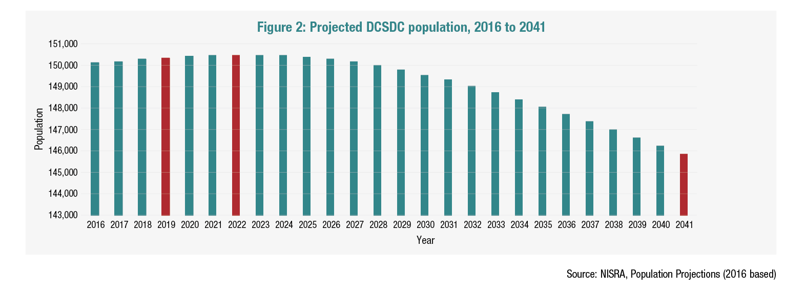 Derry and Strabane’s population is increasing. Between 2001 and 2008 the number of people rose by 4.8 per cent, however, figures show a population that is ageing. Both the 45-64 age group (38.3 per cent) and the 65 and over age group (51.4 per cent) have increased in this time frame compared to a 14.2 per cent fall in the number of children aged 15 and under. Derry City and Strabane has the lowest projected population growth of all local government districts out to 2026 at just 0.1 per cent. This compares to the likes of Armagh City, Banbridge and Craigavon and Lisburn and Castlereagh, where a population of 8.9 per cent is expected in both. The area’s expected population changes are in stark contrast to Northern Ireland as a whole, where the population is set to increase by 7.6 per cent by 2041.