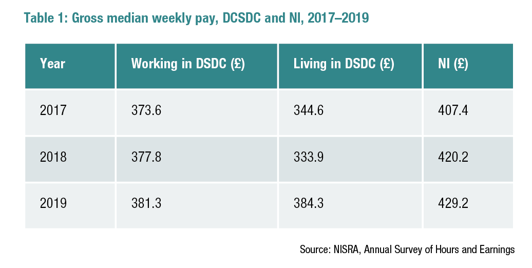 In 2019, the gross weekly median pay for those working in DCSDC was £381.30 compared to £384.30 for those who live in the council area, both of which were lower than the overall Northern Ireland average (£429.20).