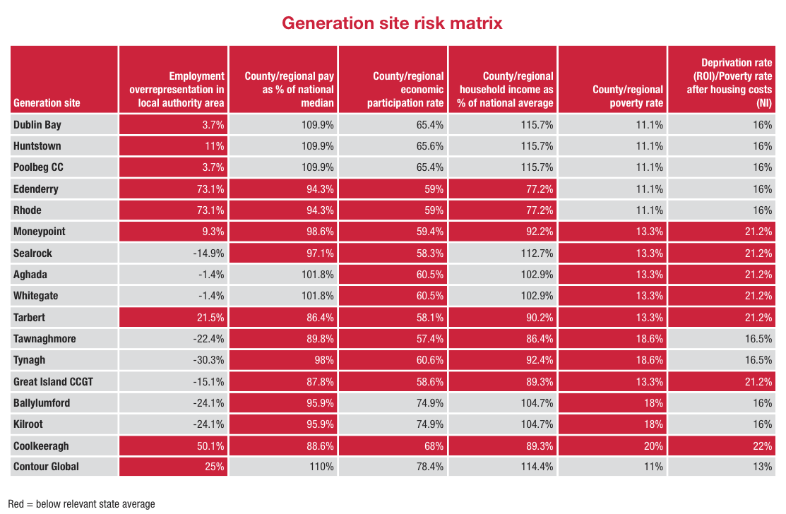 These stats, the report states, show “especially pronounced” risks for certain sites and their regions should job losses occur. Most notable among these sites are Moneypoint, Tarbert, and Coolkeeragh, which show risks across all factors measures, including broader labour market performance and poverty factors.