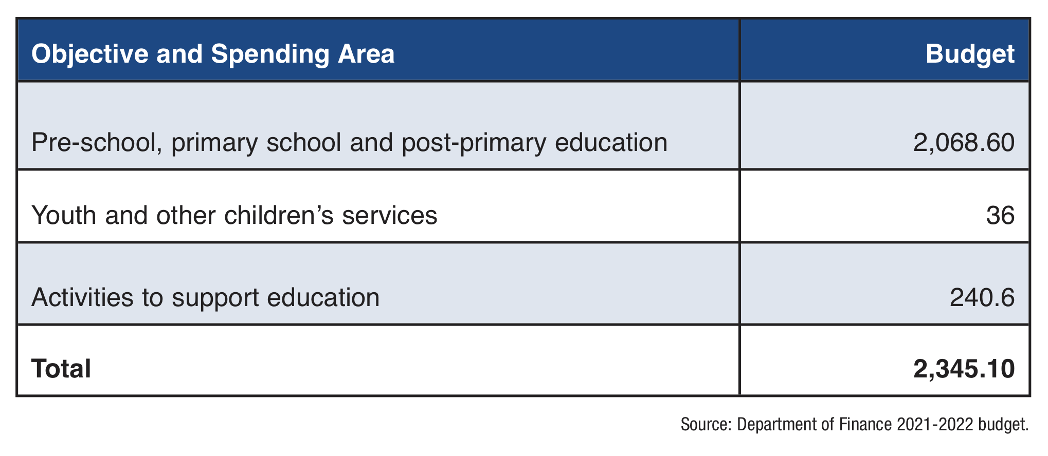 The draft budget, published without cross-party agreement and therefore unlikely to be approved without wide-ranging changes, prioritised an increase in health spending, necessitating a 2 per cent cut from most other departments. However, additional funding arising from an increase in the block grant means that the Department of Education’s allocation was set to rise beyond its 2021-22 budget allocation of £2.345 billion resource departmental expenditure limits (resource DEL) to £2.431 billion in 2022-23, £2.471 billion in 2023-24 and £2.503 billion in 2024-25.