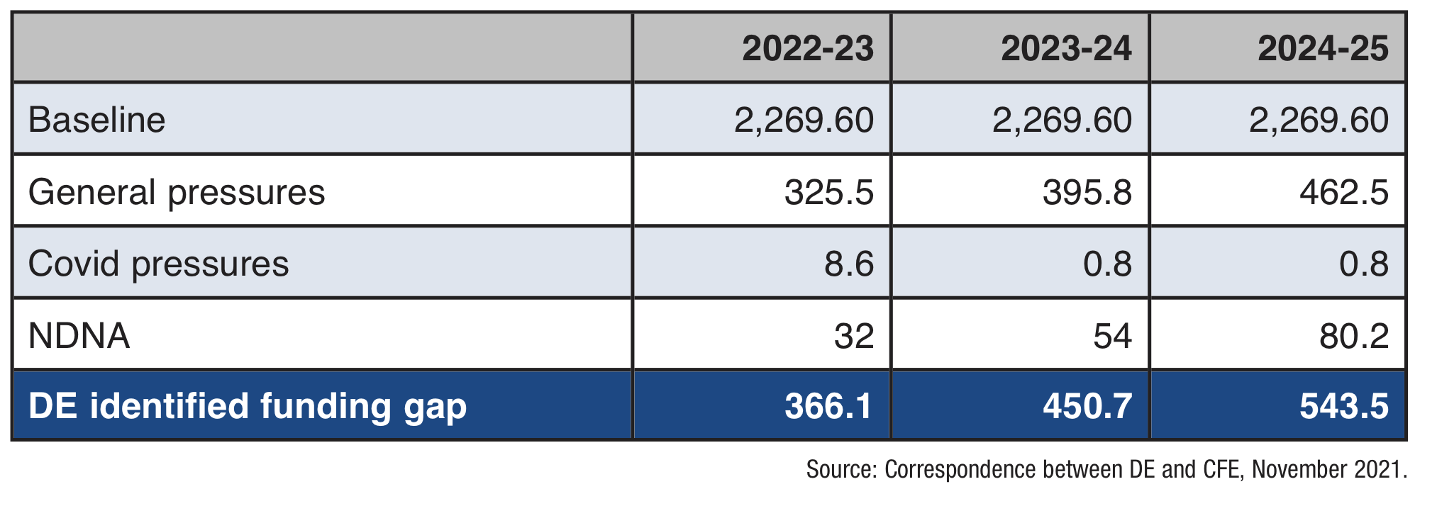 In preparation for the draft Budget, in autumn 2021, the Department of Education submitted resource bids to the Department of Finance which assumed a baseline resource DEL of £2,269.6 million. The Department of Education, taking into consideration only those pressures which are inescapable or pre-committed, reported an estimated funding gap of £367.03 million for 2022-23, with the gap increasing in subsequent years.