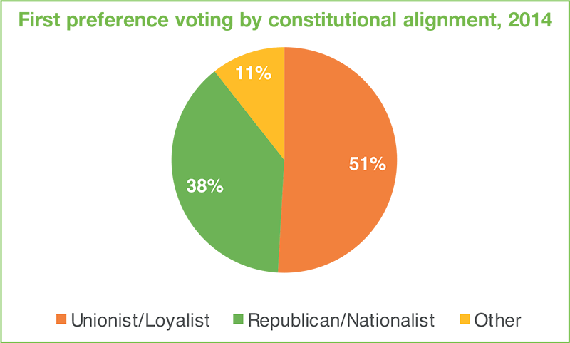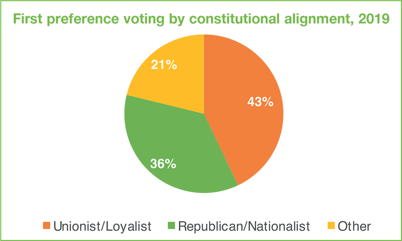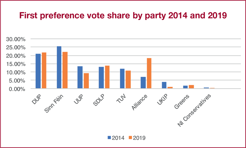This unionist decline did not deliver a boon for the explicitly republican/nationalist parties, Sinn Féin and the SDLP, although their decline, while starting at a lower base, was less pronounced than that of the unionist parties. The outright republican/nationalist vote fell from 241,407 first preference votes, 38.5 per cent of the vote in 2014, to 205,540 first preferences, 35.89 per cent of the vote, in 2019.