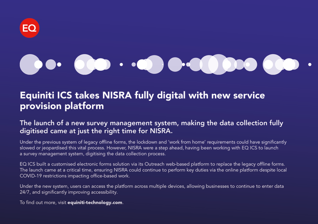 Locally Equiniti ICS has provided NISRA with an updated survey management system in the form of a new portal. This portal enables users to access the survey platform across multiple device types, from any location and is available 24/7, allowing businesses to continue to supply key survey data despite the COVID-19 restrictions impacting office-based working.
