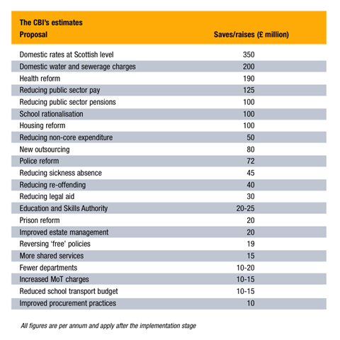 The CBI’s most direct criticism of the Executive is against “populist” policies which have cut income e.g. free prescriptions, free transport for the over 60s. Reversing these could save £19 million for core public services.