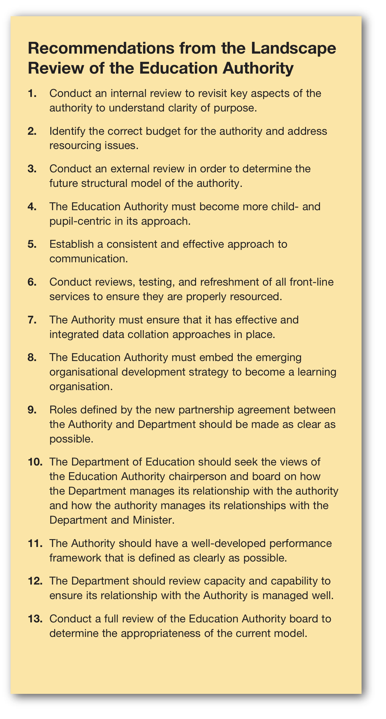 The report does, however, also note that the Education Authority, in its current form is “well aligned with the Programme for Government and the strategic priorities and delivery model are more consistent and sustainable than under the legacy organisations”, that the regional unitary delivery model is “more focused as a service delivery organisation than the legacy education and library boards ELBs”, and that “there is clear evidence emerging of improvements in scope, practices, and culture around governance”. In all, 13 recommendations are made by the review, chief among them the conduction of both internal and external reviews to better define the scope and remit of the authority and for it to become a more child- and pupil-centric organisation.