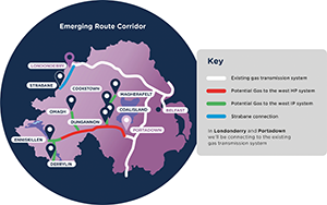 The map shown sets out the emerging route corridor for both the high pressure (transmission) pipelines (HP) and the intermediate pressure (distribution) pipelines (IP) which will bring gas to homes and businesses within the individual towns.