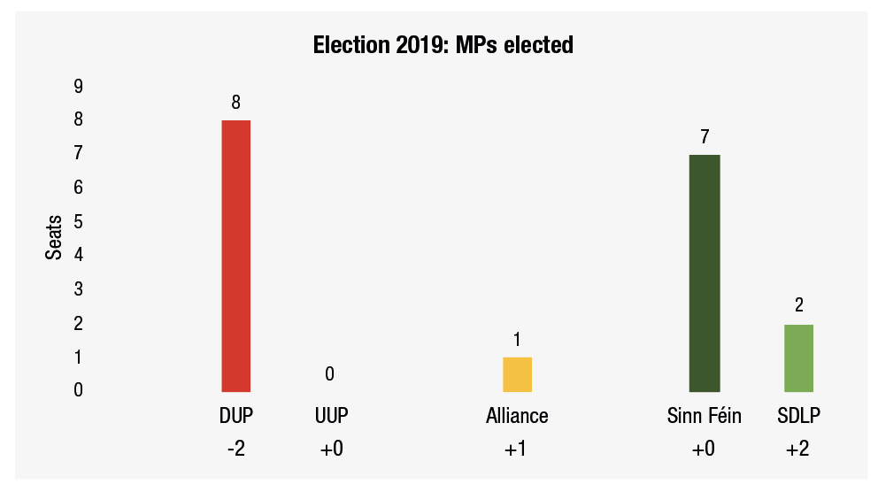 While still remaining as the holders of the largest number of Northern Ireland’s seats at Westminster, December’s general election results represented a major blow for the DUP. Losing two of its 10 previously held seats, the party also lost its influence over Boris Johnson’s government. A gain of 47 seats for the Conservatives mean that it will no longer rely on the DUP for a house majority, ending the confidence and supply agreement.