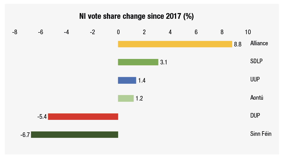 The scale of SDLP leader Colum Eastwood’s victory in Foyle was unexpected, taking 17,000 votes more than the sitting MP and a vote share of almost treble that of Sinn Féin’s. It was a similar story in South Belfast where, aided by an electoral pact which saw Sinn Féin and the Green Party not contest the seat, Claire Hanna was expected to run sitting MP the DUP’s Emma Little-Pengelly, close. Instead she won comfortably, overturning the previously held DUP majority of almost 2,000 votes to win by more than 15,000.