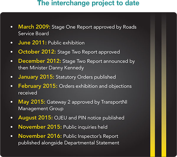 Having been described as indispensable, the Interchange proposals are heavily regarded as a project of immense importance to Northern Ireland’s economic competitiveness. The multi-million scheme will ensure an unbroken road network of 288 miles of combined dual carriageway and motorway between Randalstown, County Antrim and Cork city, thereby connecting all major ports. Currently, the only necessary stoppage occurs at the York Street Junction traffic lights.