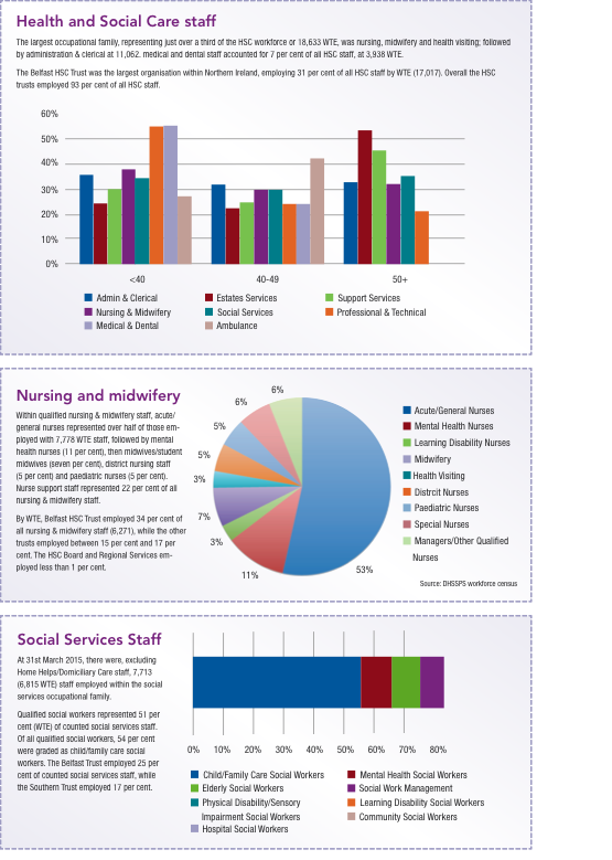 The Department of Health, Social Services and Public Safety’s workforce census is the most reliable guide to just how many people work in health and social care in Northern Ireland. The most recently published figures are accurate as of 31st March, 2015.
