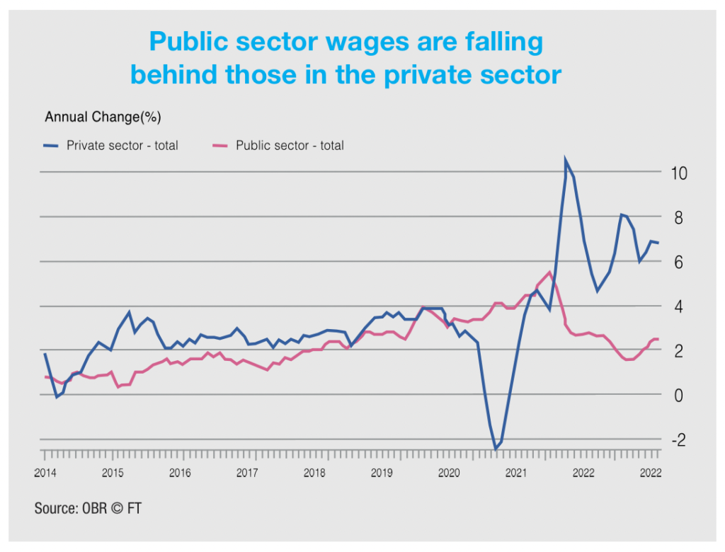 Private sector wages are currently rising at 7 per cent, lower than inflation at 11.1 per cent but higher than is sustainable for a 2 per cent inflation target. This is said to be “concerning” the Bank of England and is one the reasons interest rates are “certain” to rise from their current 3 per cent rate. Public sector wages, however, are only rising at a rate 2 per cent, creating an unsustainable gap between public and private wages.