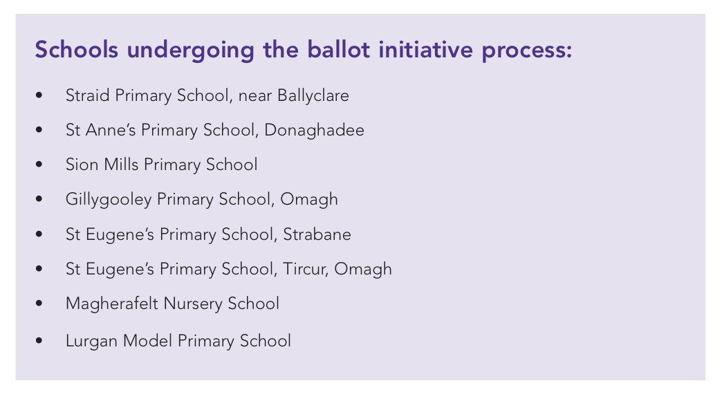 In the month of June, four schools held ballots over whether to transition to an integrated model, these were: St Eugene’s Primary School, Strabane, Magherafelt Nursery School, St Eugene’s Primary School, Tircur (near Omagh), and Lurgan Model Primary School. There are a further four schools that have undergone the ballot initiative, and are pending approval from the Minister for Education, or are awaiting further developments.