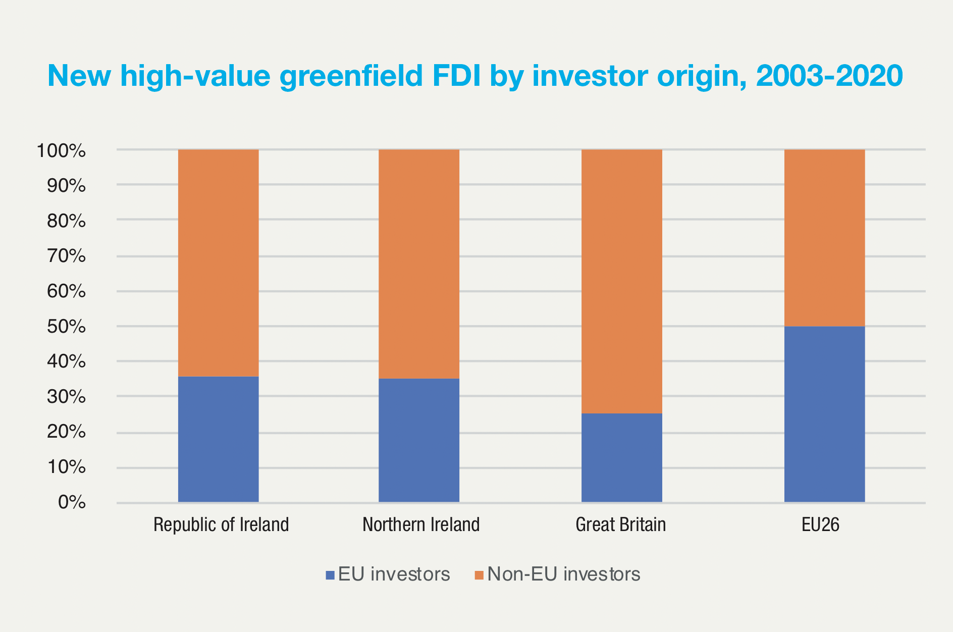 Consistent with the report’s assertion that Northern Ireland’s access to the EU’s market is giving it a comparative advantage to the rest of the UK in attracting high-value FDI are the report’s findings on the origin of high-value FDI investors from 2003-2020 in Ireland, Britain and Europe. While all markets received the majority of their high-value FDI from non-EU investors, Britain recorded a proportion of 74.4 per cent of investors from outside the EU, with Northern Ireland being next closest of the four markets with a rate of 64.8 per cent, more comparable to that of the Republic, 64.2 per cent. FDI into the EU26 was an almost perfect split, with 50.1 per cent of high-value FDI coming from outside the EU.