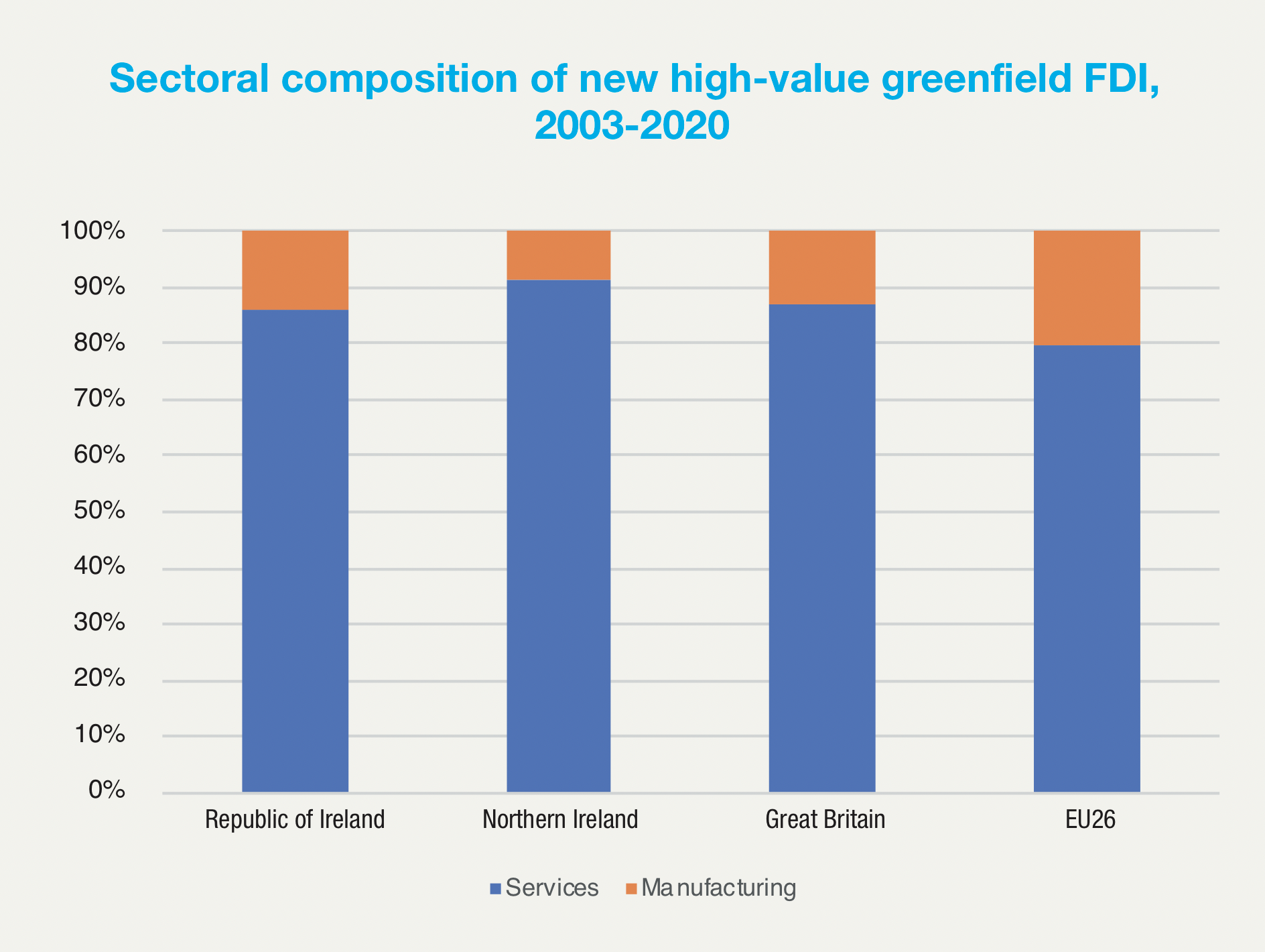 High-value FDI on both sides of the border in Ireland is dominated by services, which accounts for 86 per cent of all high-value FDI in the Republic and 91 per cent in Northern Ireland. Services account for 87 per cent and 80 per cent of the high-value FDI in Britain and the EU26 respectively.