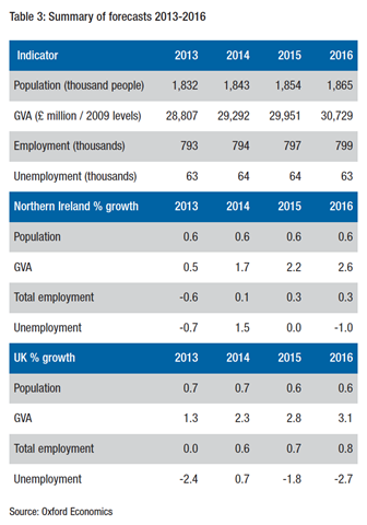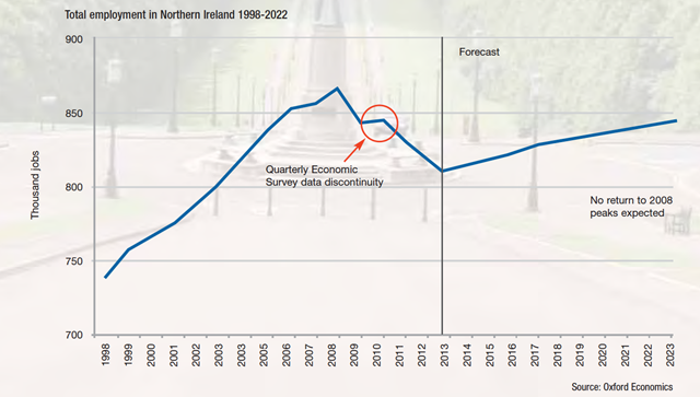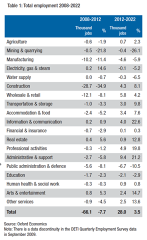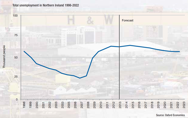 The striking feature of the latest Oxford Economics forecasts is the length of time estimated to recover recession job losses. According to workforce jobs employment data, Northern Ireland has lost 66,000 jobs between 2008 and 2013. However, the labour market outlook for Northern Ireland is relatively weak with only 28,000 jobs forecast over the decade ahead thus raising the question of: “What is needed for a more robust recovery of the Northern Irish economy?”