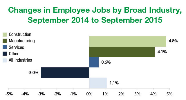 Over the year to September 2015, public sector jobs decreased by 2.6 per cent and private sector jobs increased by 2.6 per cent.