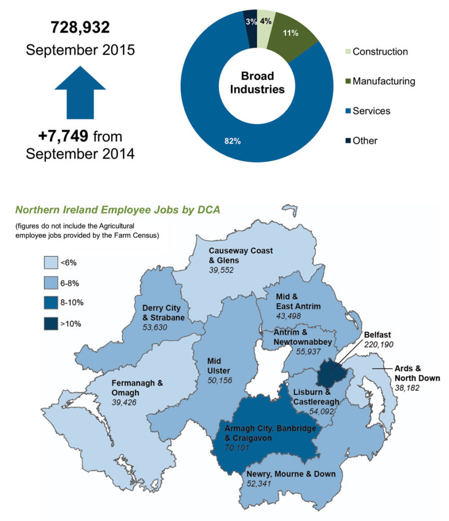 The total number of employee jobs across Northern Ireland rose by 1.1 per cent to 728,932 in 2015 up 7,749 since the previous year.