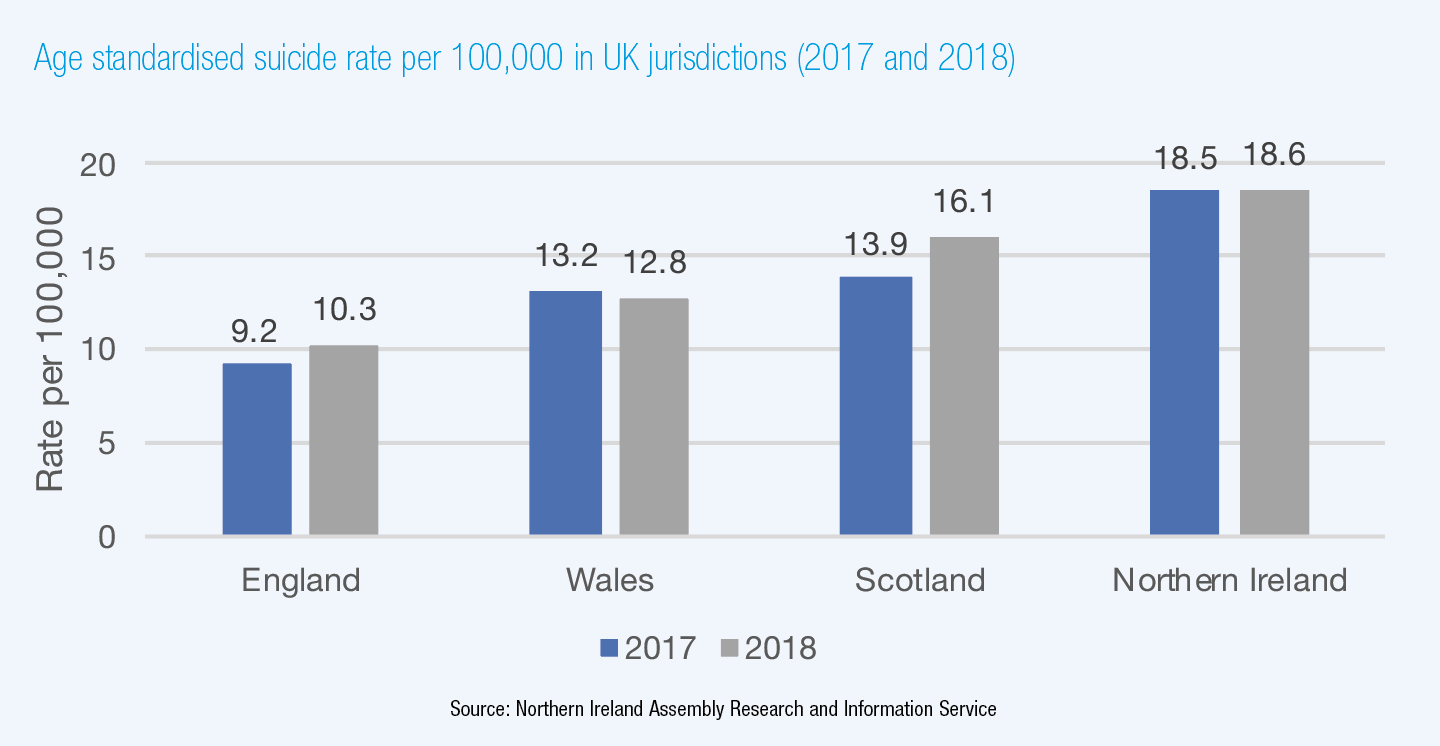 The target of a 10 per cent reduction in the suicide rate in Northern Ireland within five years would mean that the recent figure of 16.5 deaths by suicide per 100,000 of the population in Northern Ireland would be reduced to 14.9 deaths. In comparison, the overall rate in the rest of the UK is around 10.1 deaths per 100,000.