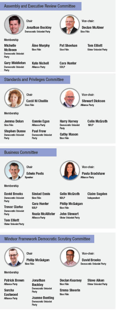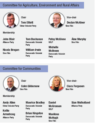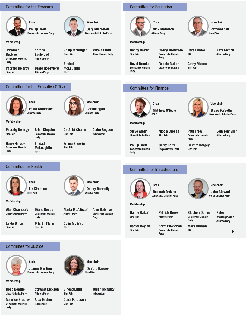 There are currently nine statutory committees, each shadowing a department, and proportionally reflecting party strength in the Assembly. Chairs and vice-chairs were nominated by parties under the D’Hondt process. Either the chair, or a vice-chair must be from a different political party to that of the minister. Membership must be made up from at least five political parties.