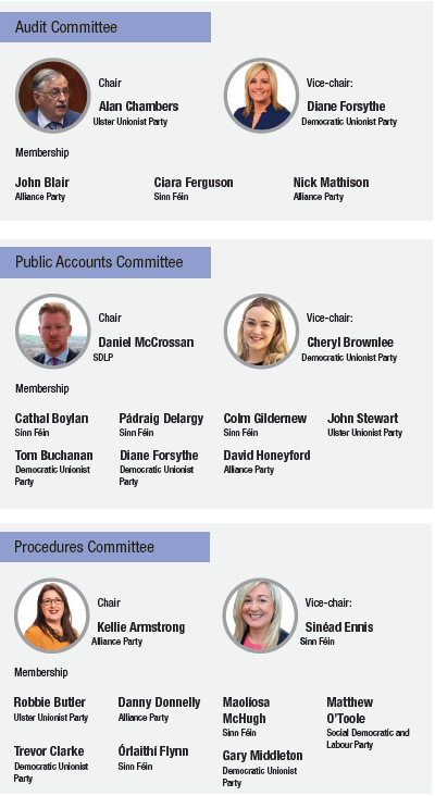The Public Accounts Committee, the most powerful of the Assembly’s committees, scrutinises the use of resources by departments and government agencies and the Standards and Privileges Committee deals with privileges and the conduct of members, and under new rules for this mandate is now chaired by the Official Opposition party.