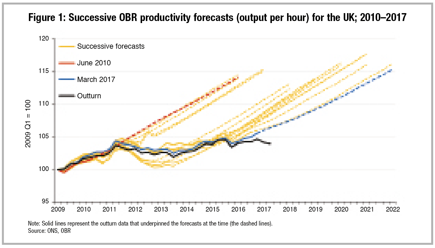 Turning to the period after the recession, he points out that the original OBR productivity forecasts for 2010-2017 and the subsequent 20 forecasts, based on outturn data, were far more optimistic than the eventual outcome (see figure 1).