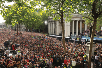 A party atmosphere pervaded the crowd who had been whipped up into a frenzy with performances by Jedward, Westlife and other Irish musicians and appearances by actors such as Brendan Gleeson who said: “I am fed up looking at the ground; it is time to stand up.” Sports stars Robbie Keane and Padraig Harrington were on stage and the Irish rugby team captain Brian O’Driscoll, who was carrying the Heineken Cup his Leinster team won in a nail-biting comeback in Cardiff the previous weekend, was met with rapturous applause.