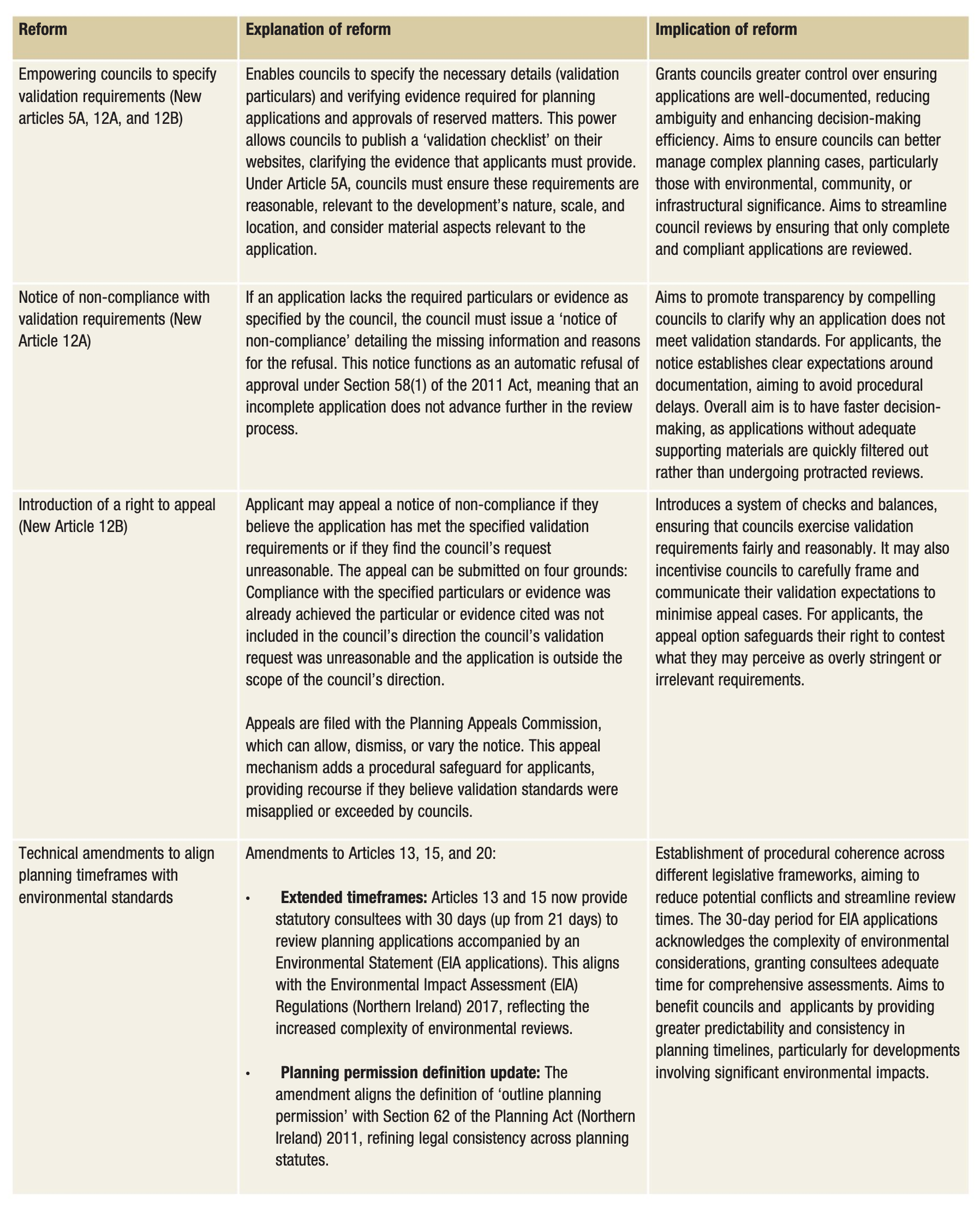 Speaking in October 2024, the Minister for Infrastructure John O’Dowd MLA said that the reforms are designed to “improve planning performance with better quality applications entering the system, resulting in shorter processing times, more efficient consultee responses and quicker planning decisions”.