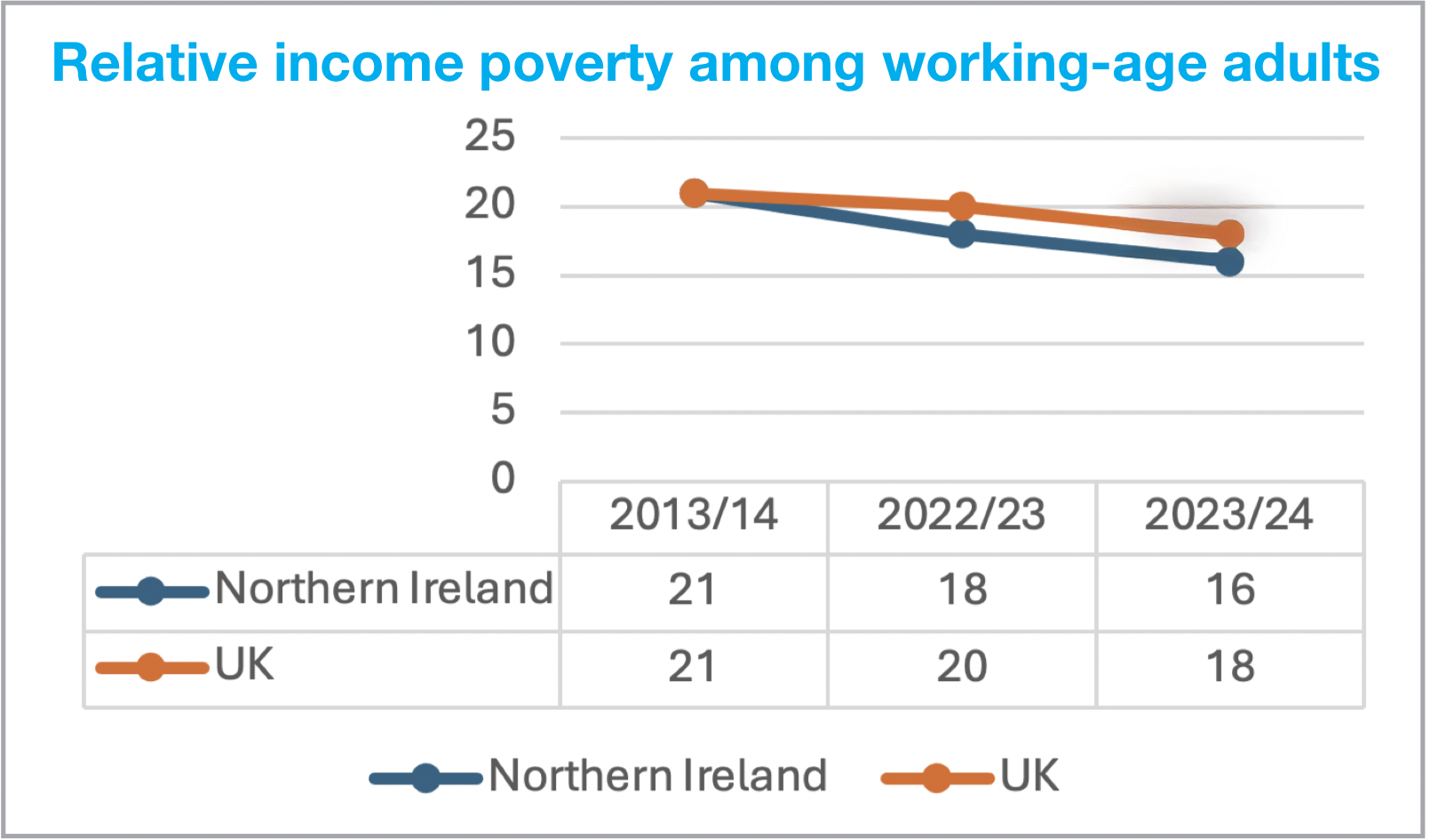 Approximately 16 per cent (185,000) of working-age adults in Northern Ireland were in relative income poverty in 2023/24, below the UK rate of 19 per cent. This represents a decrease from 2022/23 when it stood at 18 percent, while the UK rate also fell from 20 per cent. Overall, relative income poverty in Northern Ireland has decreased from 2013/14 when it stood at 21 per cent (225,000), in line with the UK rate that year.