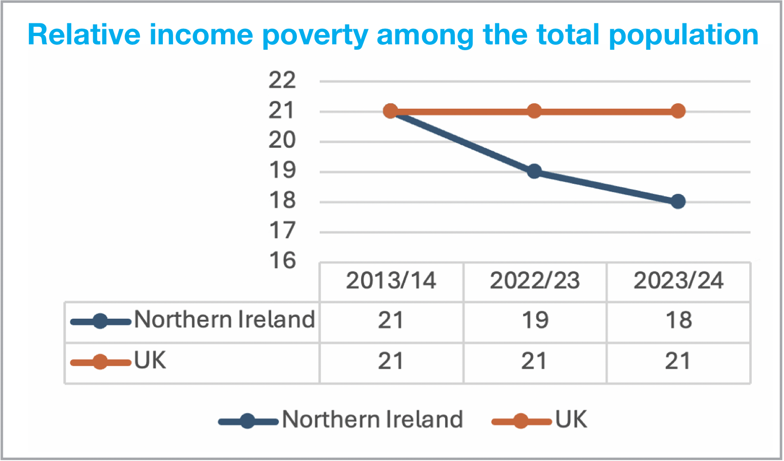 There was a slight fall in relative poverty between 2022/23 and 2023/24 according to data from the Northern Ireland Poverty and Income Inequality report 2023/24, published by the Department for Communities (DfC) in March 2025.