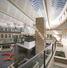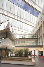 An atrium in the centre of the building extends over three floors from the busiest area on the ground floor around the nurse treatment area, reception and café, to the glass panelled roof and is criss-crossed with bridges leading to various colourcoded sections of the building.