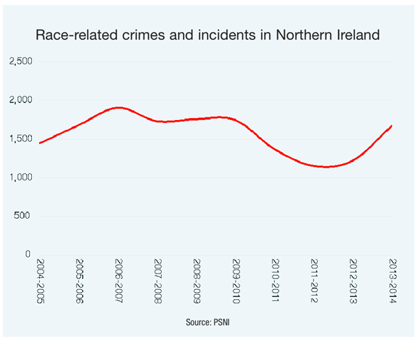 Resentment towards migrants increased alongside the rise in unemployment during the economic downturn. However, the number of racial incidents reported to the PSNI had peaked at 1,908 in 2006-2007 well before the recession began. The number of incidents remained high over the next three years before falling and then rising again to 1,673 in 2013-2014. That increase coincided with a general rise in sectarian tension.