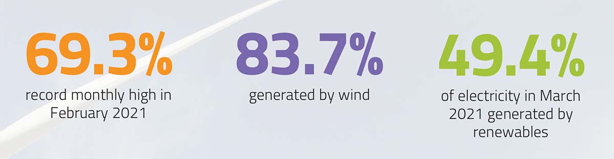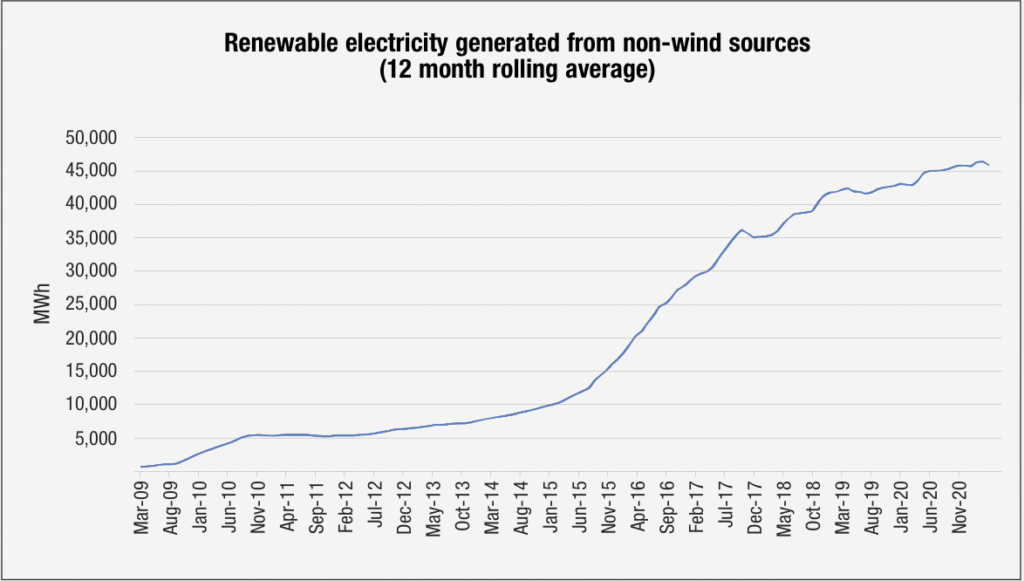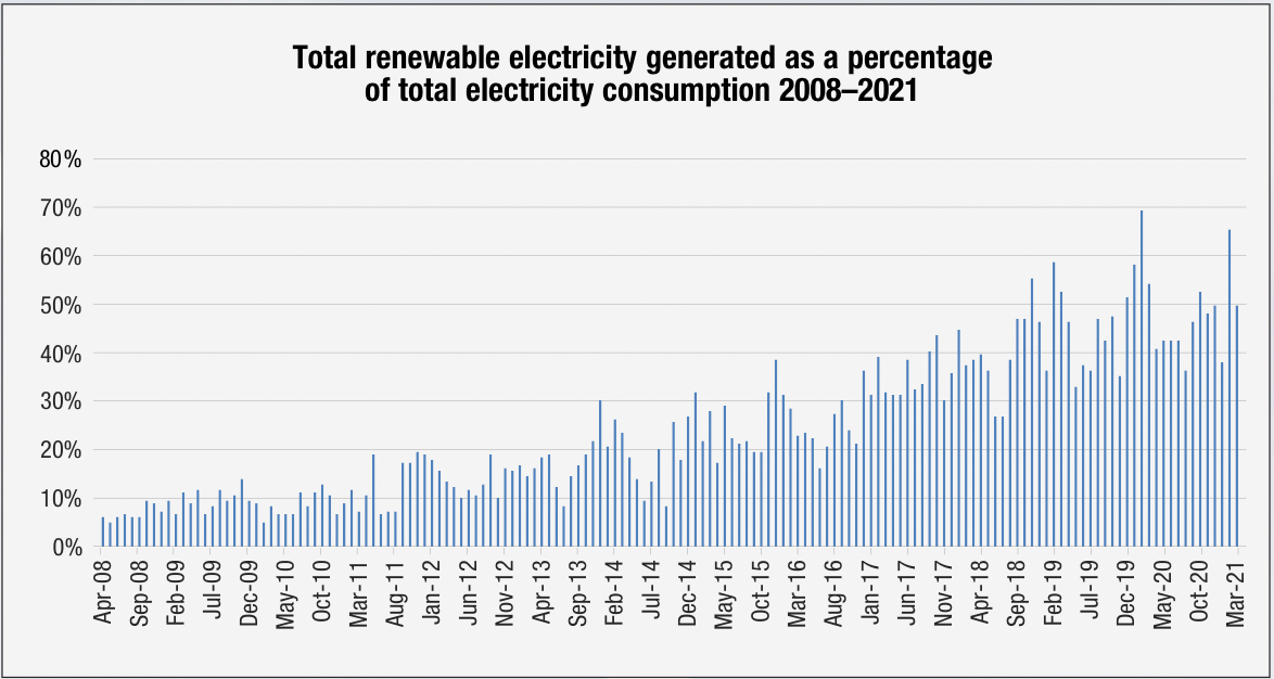 The figures for March 2020 to March 2021 represent a slight decrease of 0.5 per cent on the previous 12-month period and March’s 2021’s 49.4 per cent of electricity consumed from renewable sources is also less than the 54 per cent recorded for the same month a year ago.