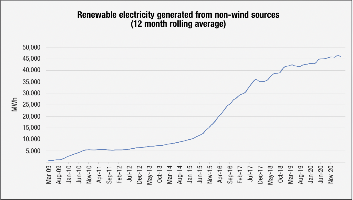 The proportion of renewable electricity generation has not fluctuated much between wind and non-wind sources over the last two years but looking over a longer term, it is evident that non-wind renewable generation volumes have substantially increased in recent years.