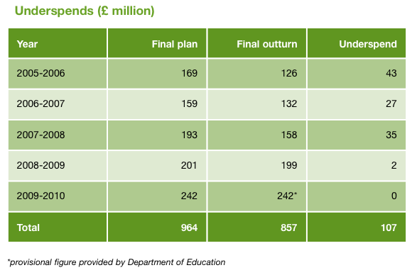 Most of the underspend took place under direct rule, with the devolved Education Minister making sure that almost all the money is now spent each year. However, after those years of plenty, major cuts are on the way for the capital budget.