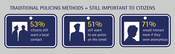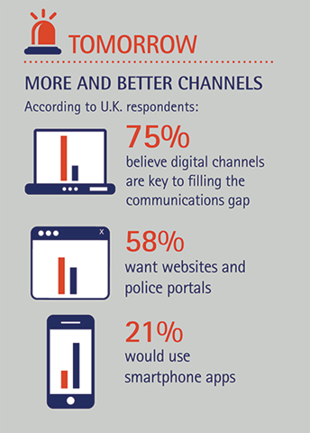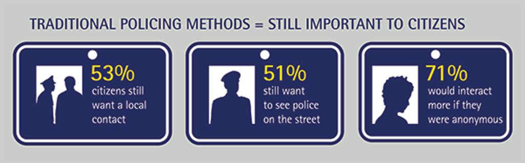 Overall, the survey findings show a strong desire by citizens in the UK and overseas not only to change the way they interact with the police but also to support their local force to deliver crime-fighting services in new ways. Citizens now want to receive and share information with police through their method of choice – a digital channel and, increasingly, a mobile one – and they are looking for ways to engage with police while reserving the option of anonymity.